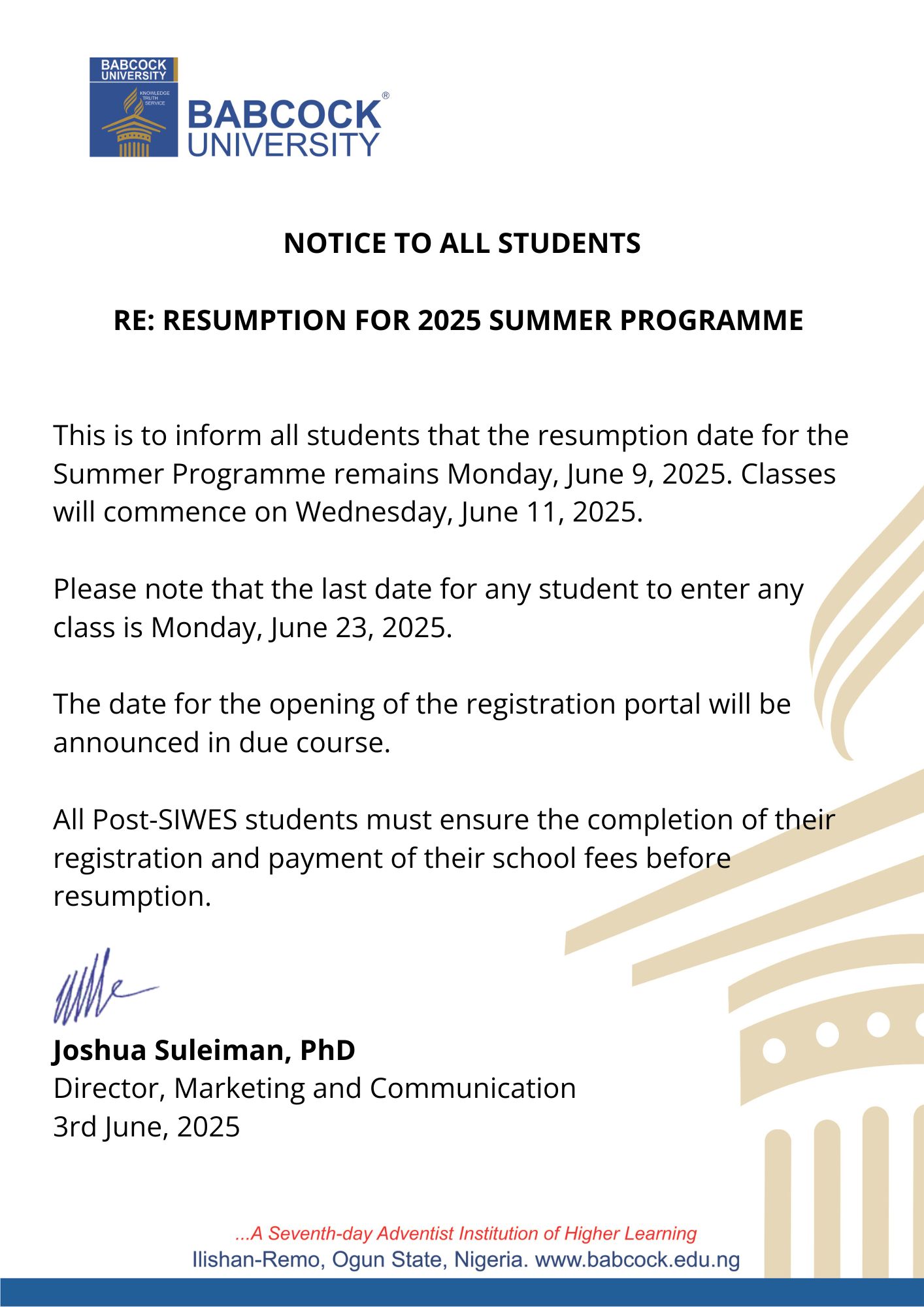 Babcock University 2025 Summer Programme Resumption Date