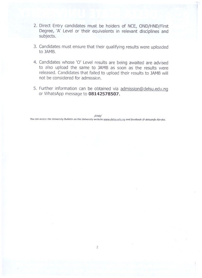 • Send an email to: admission@delsu.edu.ng
