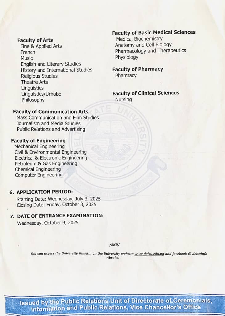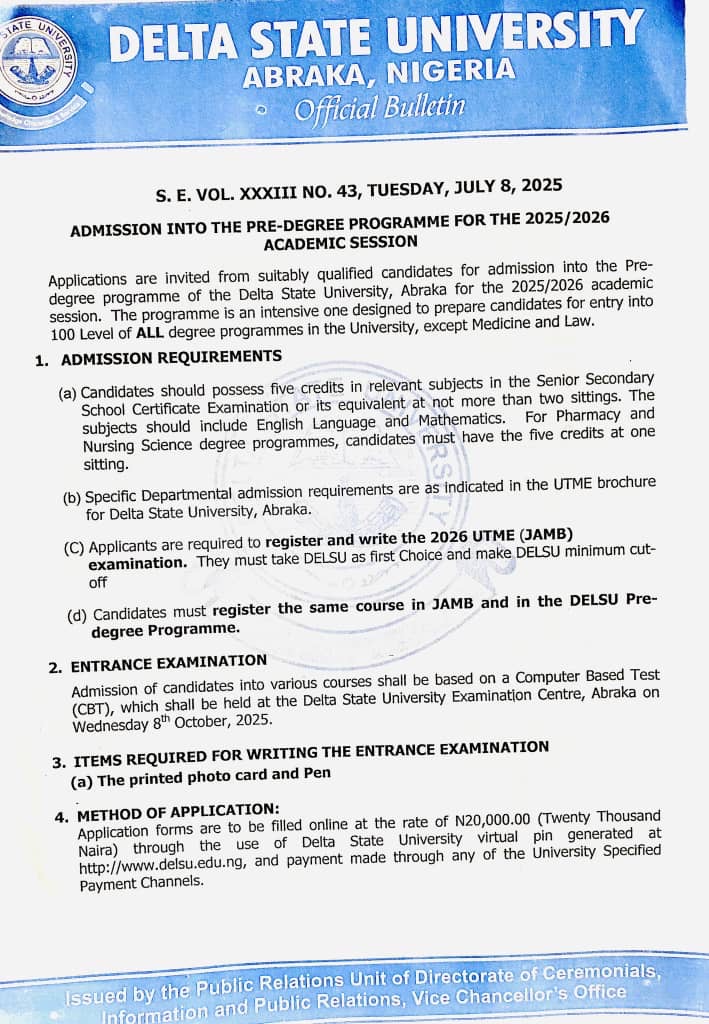 • Candidates must sit for the 2026 UTME (JAMB) and select Delta State University (DELSU) as First Choice.