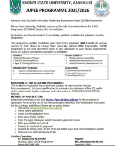 This programme leads to the award of JUPEB certificate which enables candidates gain Direct Entry admission into Ebonyi State University without JAMB Examination.