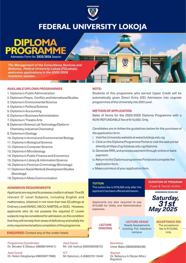 Are you seeking an opportunity to further your education, boost your qualifications, or prepare for direct entry into a degree programme? The Federal University Lokoja (FULOKOJA) has officially announced the sale of its Diploma Admission Form for the 2025/2026 academic session. This is an excellent opportunity for prospective students who wish to enroll in a recognized and accredited diploma programme in Nigeria.