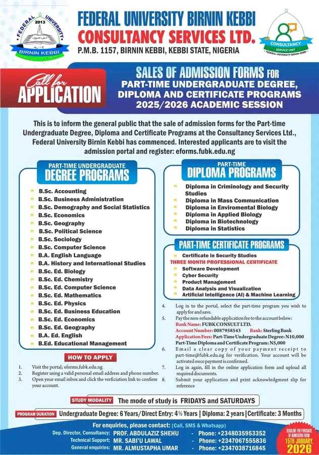 This is to inform the general public that the sale of admission forms for the Part-time Undergraduate Degree, Diploma and Certificate Programs at Federal University Birnin Kebbi (Consultancy Services Ltd.) for the 2025/2026 academic session has commenced. Interested applicants should register via the University admission portal: eforms.fubk.edu.ng.