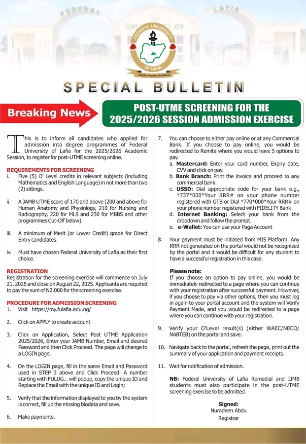 Are you seeking admission into the Federal University of Lafia (FULAFIA) for the 2025/2026 academic session? Great news! The FULAFIA Post-UTME and Direct Entry Screening Form for the 2025/2026 academic session is officially out. This post covers everything you need to know — eligibility criteria, cut-off marks, application deadline, and step-by-step registration procedures.