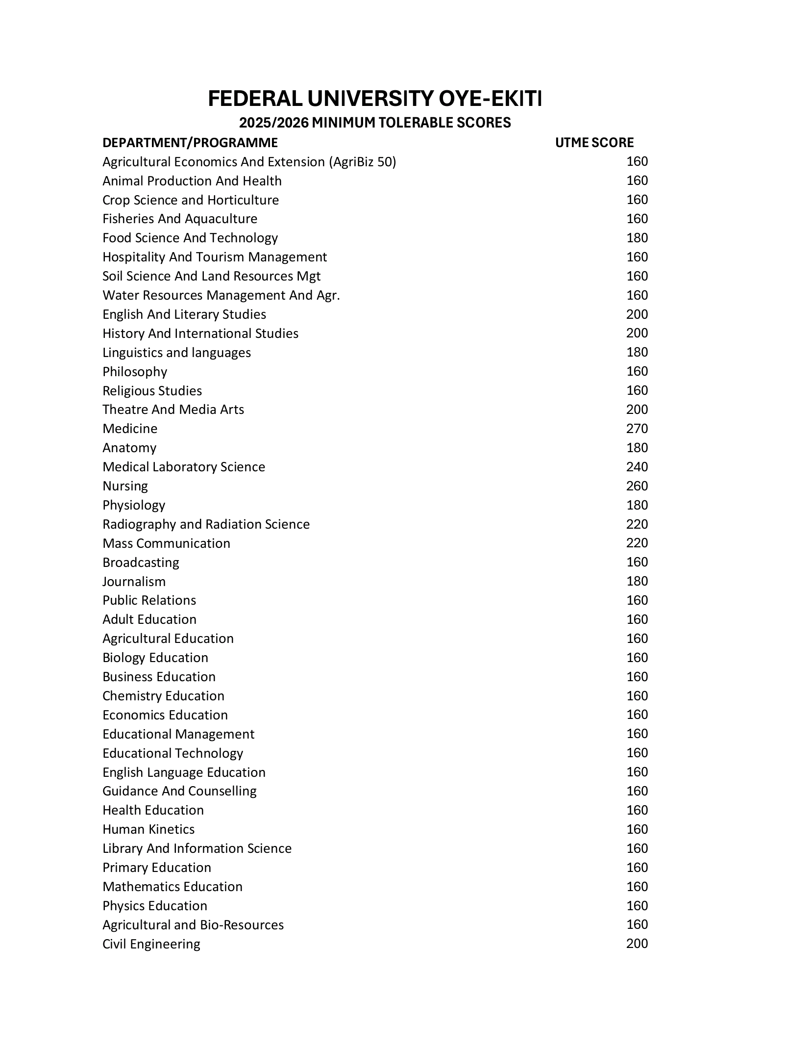 News & Updates University FUOYE JAMB Cut-off Marks For 2025/2026 Now Out By admin July 22, 2025 The Management of Federal University Oye-Ekiti, under the leadership of the Acting Vice-Chancellor, Prof Olubunmi Shittu, has approved and released the minimum tolerable UTME scores for the 2025/2026 academic session. Kindly find them below: Post navigation Prev post: Prev PostNext post: Next Post 0 CommentsClose Comments Leave a comment Cancel replyName E-mail Save my name, email, and website in this browser for the next time I comment. Comment By using this form you agree with the storage and handling of your data by this website. For further details on handling user data, see our Privacy Policy