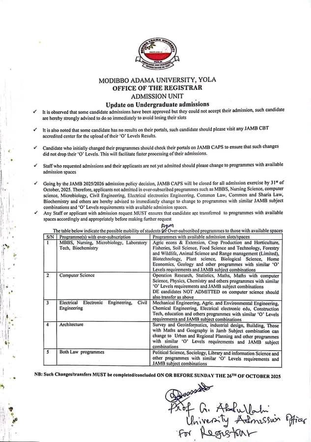 The Management of Modibbo Adama University (MAU), Yola has released an important notice to all UTME and Direct Entry candidates participating in the 2025/2026 admission exercise. The update, issued by the Office of the Registrar (Admission Unit), contains urgent instructions for candidates yet to complete their admission process on the JAMB CAPS portal.