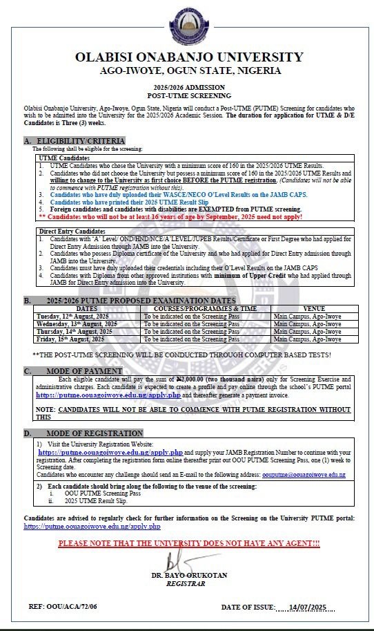The 2025/2026 OOU Post-UTME screening will be held as follows: