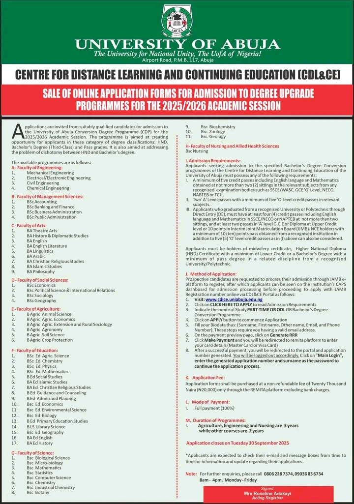 Are you a Higher National Diploma (HND) holder OR a graduate with a third class or pass degree seeking to upgrade your qualification? The University of Abuja (UNIABUJA) invites applications for its Bachelor’s Degree Conversion Programme (CDP) under the Centre for Distance Learning and Continuing Education (CDL&CE) for the 2025/2026 academic session.