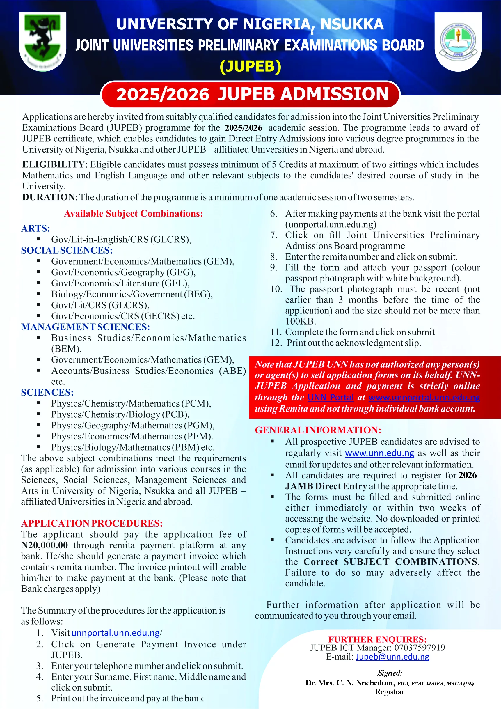 GENERAL INFORMATION: All prospective JUPEB candidates are advised to regularly visit www.unn.edu.ng as well as their email for updates and other relevant information.All candidates are required to register for 2026 JAMB Direct Entry at the appropriate time.The forms must be filled and submitted online either immediately or within two weeks of accessing the website. No downloaded or printed copies of forms will be accepted.Candidates are advised to follow the Application Instructions very carefully and ensure they select the Correct SUBJECT COMBINATIONS. Failure to do so may adversely affect the candidate.Further information will be communicated to the candidates through their email.FURTHER ENQUIRES:JUPEB ICT Manager: 07037597919E-mail: Jupeb@unn.edu.ng/Sgd./Dr. Mrs. C. N. Nnebedum, FIIA, FCAI, MAIEA, MAUA (UK)Registrar.