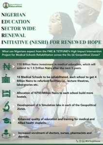 In a major stride towards transforming Nigeria’s healthcare and education sectors, the Federal Ministry of Education, in partnership with TETFund, has unveiled a bold initiative under the High Impact Intervention Project to rehabilitate 18 medical schools across the country’s six geopolitical zones.This N110 billion investment marks a strategic milestone in the actualization of the Nigerian Education Sector-Wide Renewal Initiative (NESRI), with a focus on strengthening STEMM—Science, Technology, Engineering, Mathematics, and Medical Sciences.